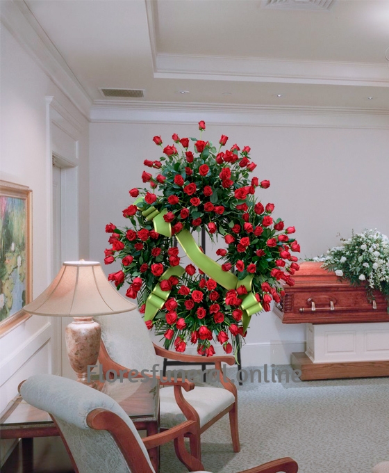 Espectacular Corona Supreme Rosas para difuntos. Esta elegante corona de rosas, está realizada con cuatro cabezales de flores para tanatorio. La corona de flores de rosas para funeral está decorada con preciosos verdes como el viburnum verde, robelini y hojas tropicales. La Corona Supreme Rosas Rojas es uno de los arreglos florales funerarios más elegantes para expresar sus condolencias al difunto.